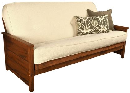 The Kodiak Furniture Lexington Futon in Canton Cream/Weathered Brown offers functionality with a solid hardwood frame and a full-size mattress. It supports three positions for sitting, lounging, and sleeping, providing versatility for any space.Read More