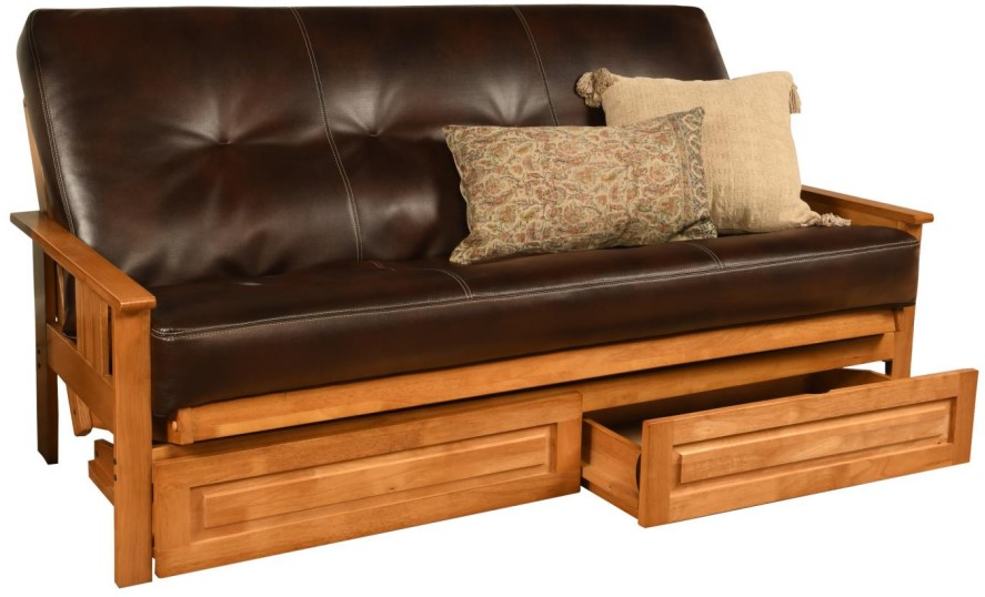 This futon frame has two optional drawers for out-of-sight storage