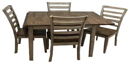 Includes Solid Hardwood Rectangular Dropleaf Table and 4 Ladderback side chairs. Table Dimensions: 36in W x 32/48in L x 30in H Chair Dimensions: 18in W x 22in D x 38in H