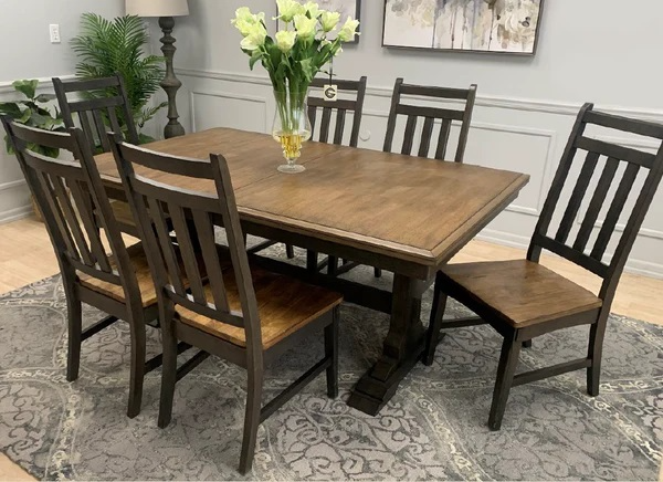 Includes Rustic Two Tone Trestle Table with 18in. self-storing butterfly leaf with 6 side chairs. Optional add-on for a bench is available. Table dimensions: 42in W x 66/84in D x 30in H Chair Dimensions: 24in W x 24in D x 40in H