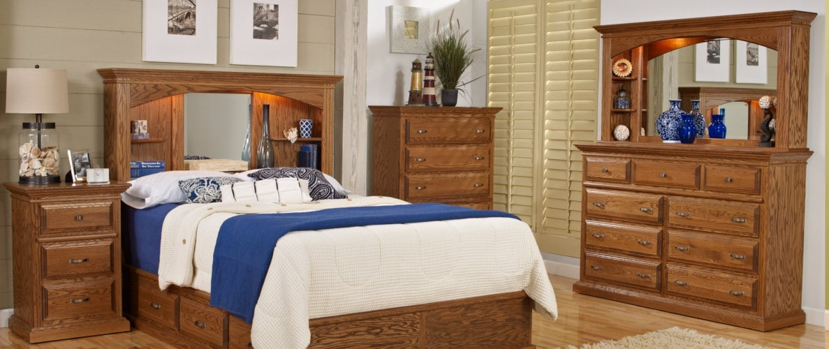 Wolfcraft Mckinley Bedroom Collection. This includes the bookcase queen headboard with 6 drawer foundation, three drawer nightstand, 9 drawer dresser, 5 drawer chest. This is available in Oak or Maple wood and has 12 different stain options.Mirror is not included in price, to add the mirror $689Read More