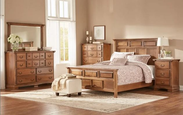 Wolfcraft Stonehaven bedroom collection. This includes the panel bed frame complete with slats, 3 drawer nightstand, master dresser and 5 drawer chest. This is available in Oak or Maple wood and has 12 different stain options. Mirror is not included in price, if you're interested in the mirror it is an additional price of $729Read More