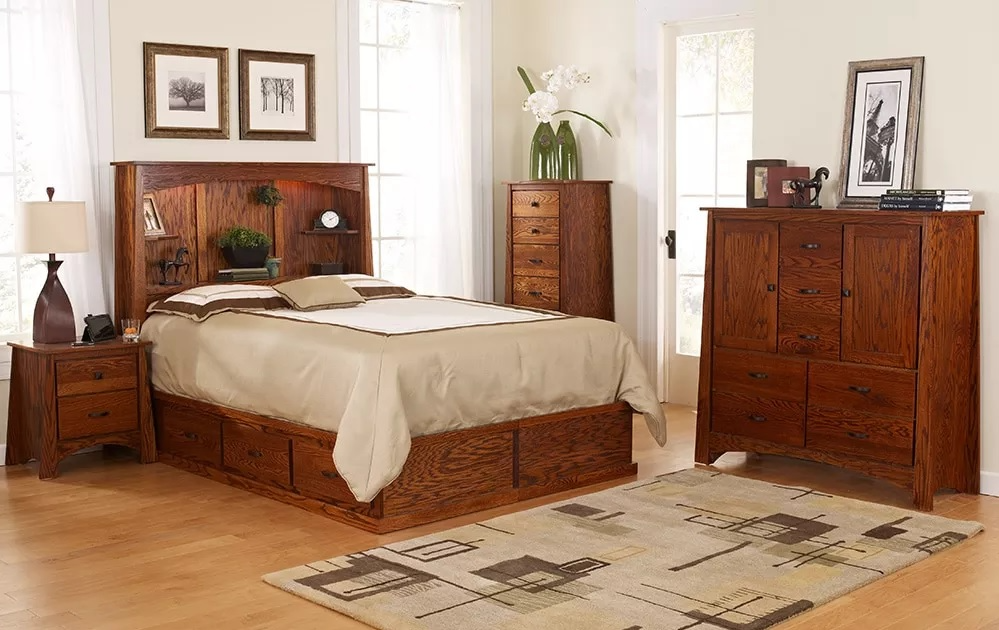 Wolfcraft Unity bedroom collection. This includes a bookcase headboard and 6 drawer queen foundation, lingerie chest, 2 drawer nightstand and a clothing coffer. This is available in Oak or Maple wood and has 12 different stain options.Read More